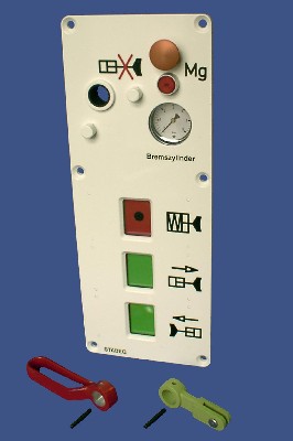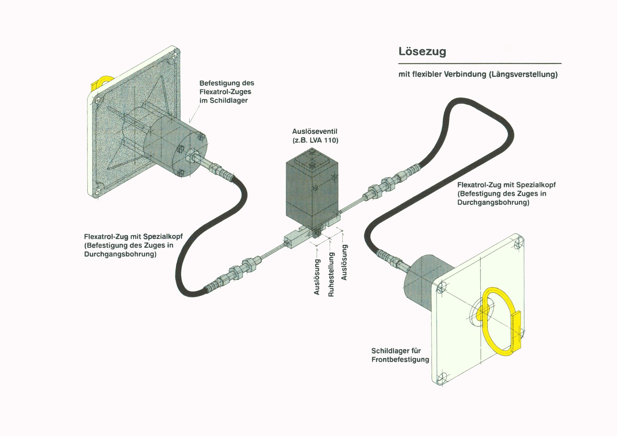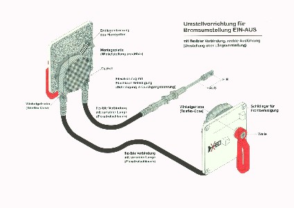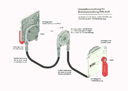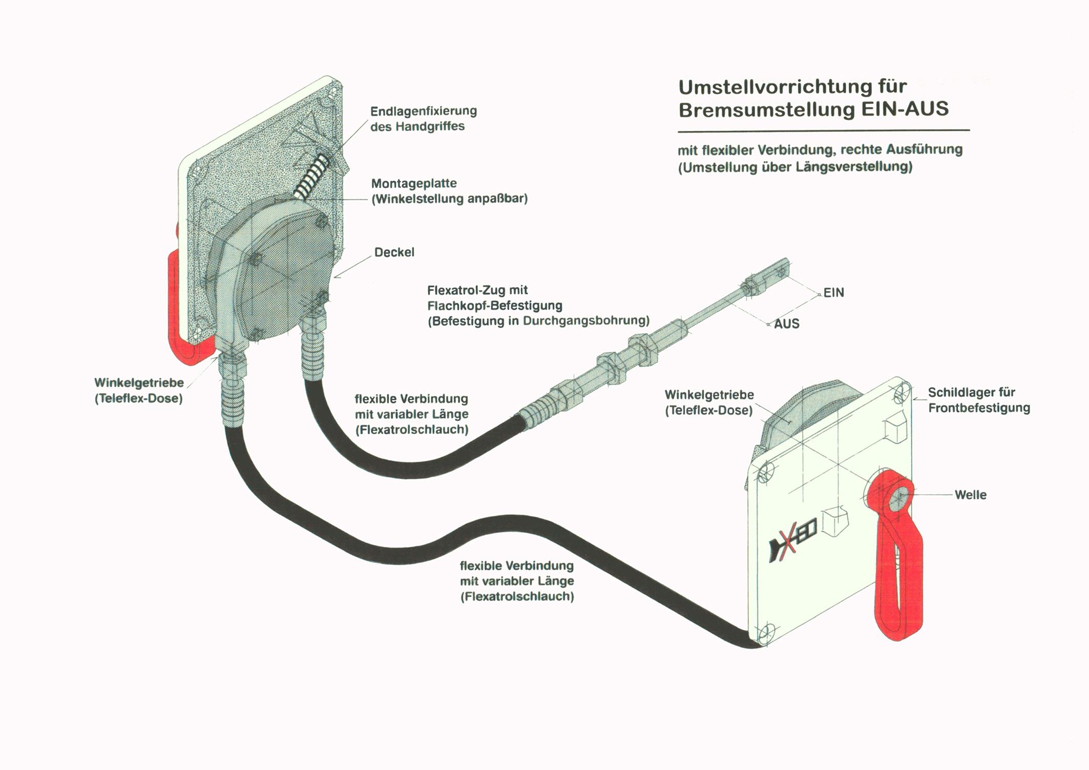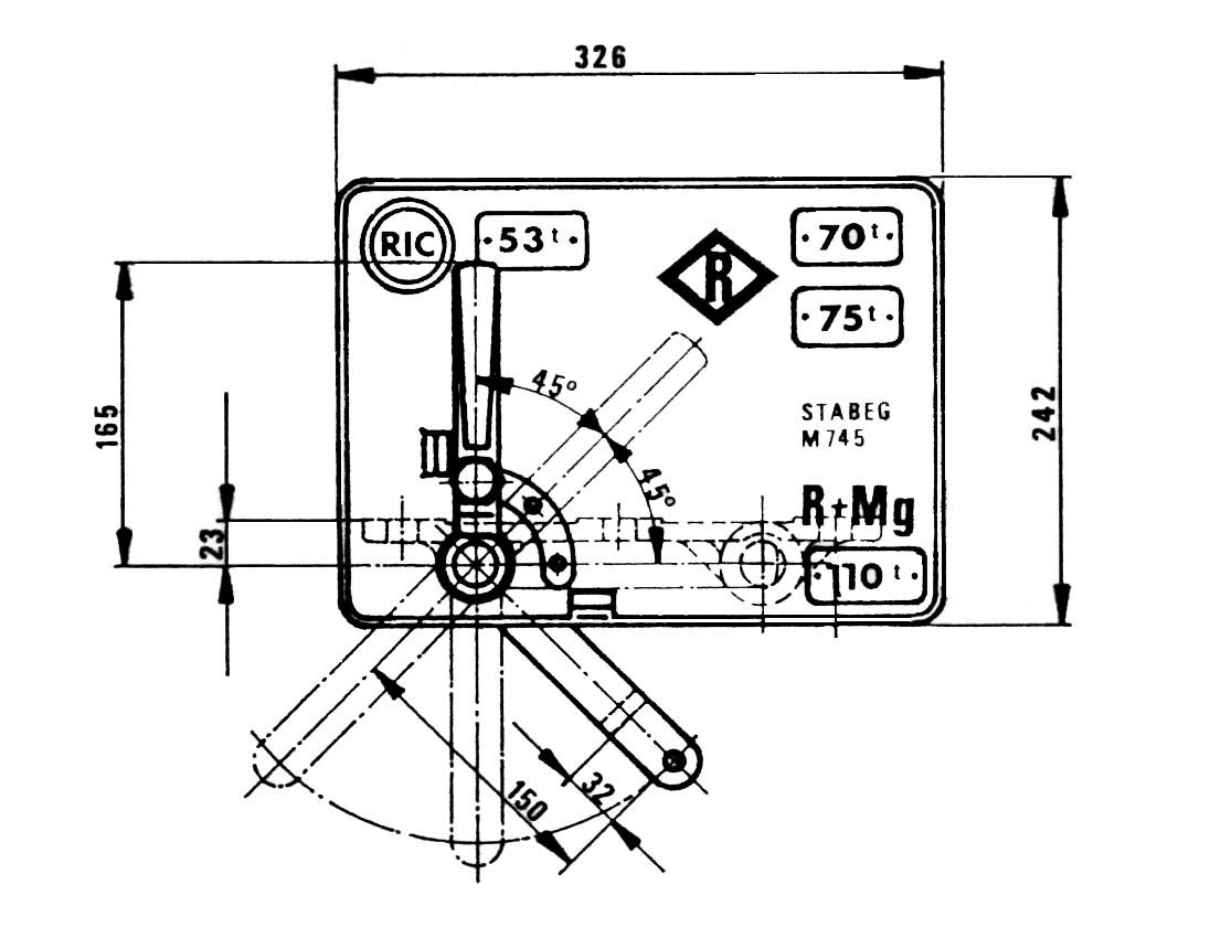 ![]() | Die Verbindung von einer Wagenseite zur anderen erfolgt über eine Welle Ø25h11 (Anteil Waggonbaufirma), die gleichen Hebel-Stellungen werden durch zwei Zahnsegmente erreicht. Die Betätigung der Bremsart an den Geräten der Bremse erfolgt über Gabelhebel (ZNr. 10413-3) und Gestänge. Schilder aus Aluminium-Kokillenguß, Lagerungen mit Kunststoff-Buchsen versehen. |